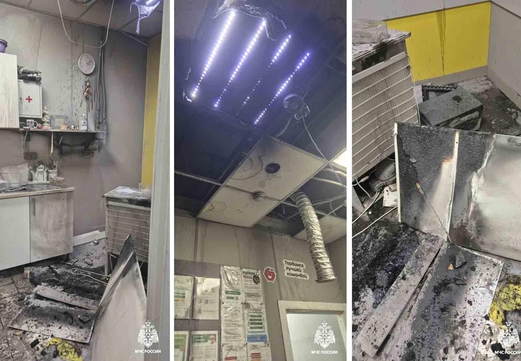 Огонь повредил потолок и кухонное оборудование на площади 2 кв.м. в комнате приема пищи в магазине. Причина и обстоятельства устанавливаются.